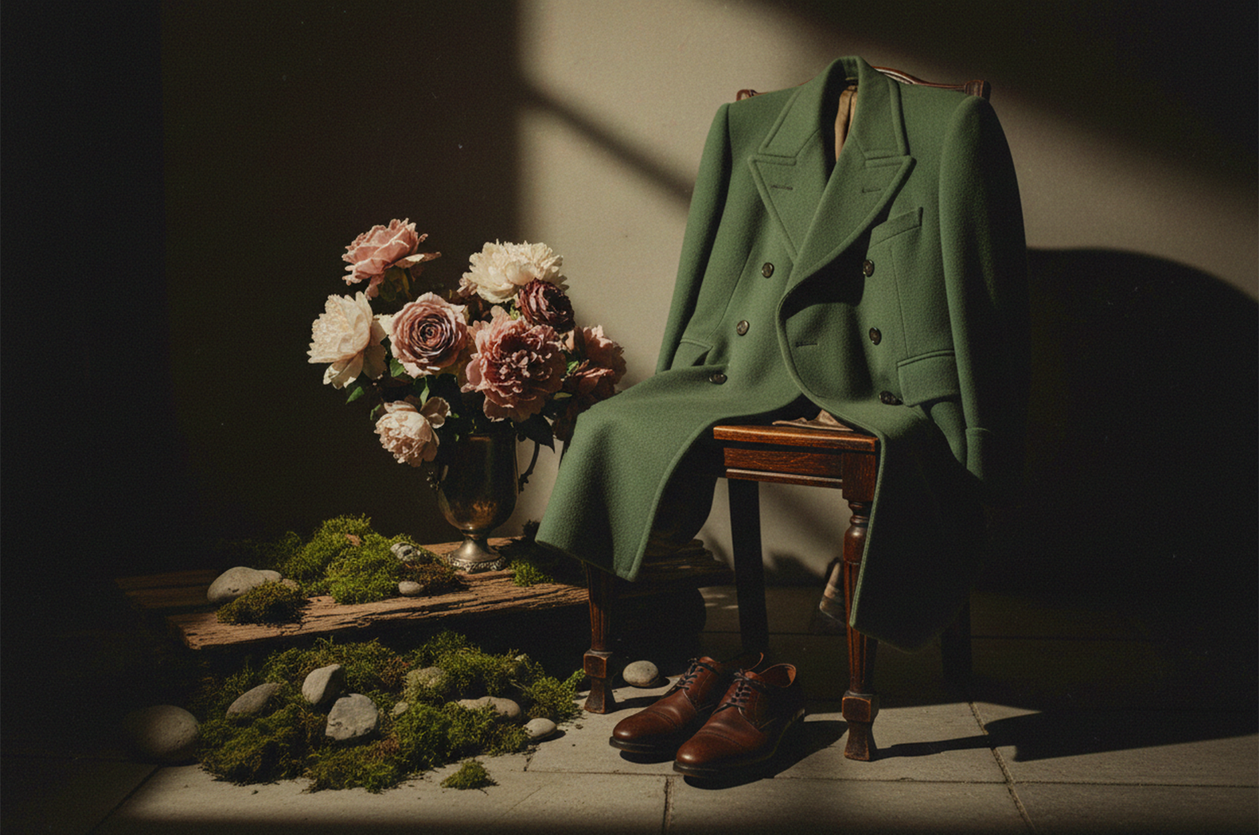 Imagine a tailored coat, pressed and precise, draped over shoulders poised for both duty and desire. Polished shoes tap rhythmically against rain-slicked pavements. In the air, powdery florals mingle with the faint curl of cigarette smoke, drifting from an elegant hand lifted in conversation. A train whistle echoes in the distance, and moss-laden woods stretch into twilight beyond the city, holding stories of whispered promises and clandestine meetings.